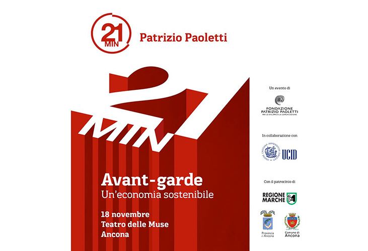 Sabato 18 novembre, dalle ore 11 alle 19, il sipario del Teatro delle Muse di Ancona si alzerà su “21 Minuti Avant-garde. Un’economia sostenibile”, evento realizzato da Fondazione Patrizio Paoletti - ente nazionale di ricerca e formazione in campo neuroscientifico e psicopedagogico - in collaborazione con UCID - Unione Cristiana Imprenditori Dirigenti.