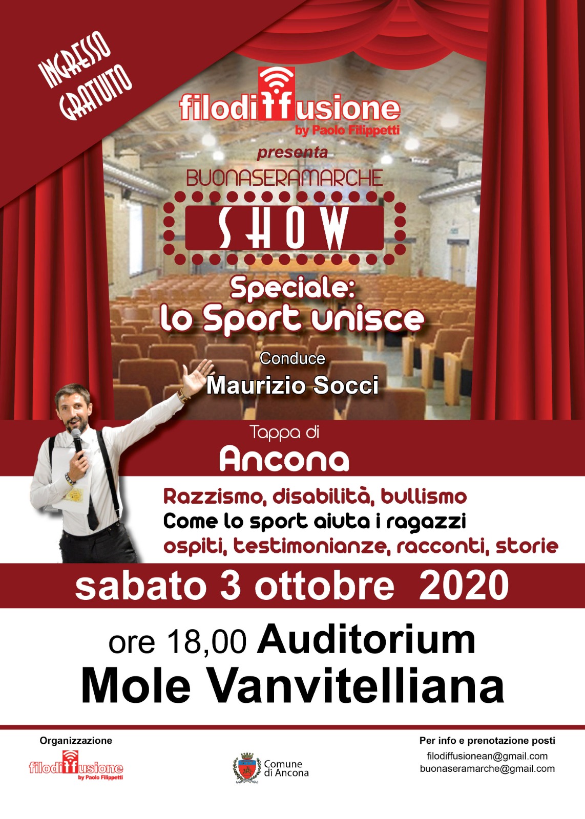 Condurrà lo show, il bravissimo giornalista dorico Maurizio Socci, che accompagnato da figure di spessore come l'Assessore allo Sport Andrea Guidotti, il Presidente di CONI Marche Fabio Luna, il Presidente del Comitato Italiano Paralimpico Tarcisio Pacetti e molti altri, dovranno raccontare come i valori sportivi possano essere per i giovani un punto di partenza per lottare contro razzismo e bullismo.