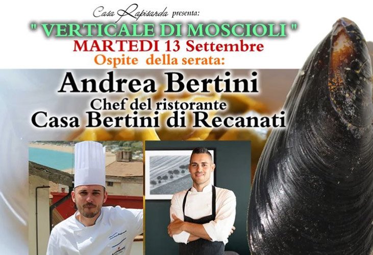 Da questo incipit nasce la Verticale dei Moscioli dello Chef Alessandro Rapisarda, titolare del Ristorante Casa Rapisarda di Numana e gran conoscitore del Mosciolo Selvatico di Portonovo. Ogni estate, si cimenta in questo "esperimento a quattro mani" con alcuni dei più bravi Chef delle Marche (e non solo). Questa volta, lo Chef ospite dell'evento dovrebbe esservi già noto. Infatti, parliamo di Andrea Bertini, il talentuoso ragazzo titolare del Ristorante Casa Bertini di Recanati (qui l'articolo a lui dedicato). I due, dotati di una interessante idea di cucina, non sono nuovi al lavoro di squadra, difatti la loro amicizia è sbocciata negli anni di scuola alberghiera.