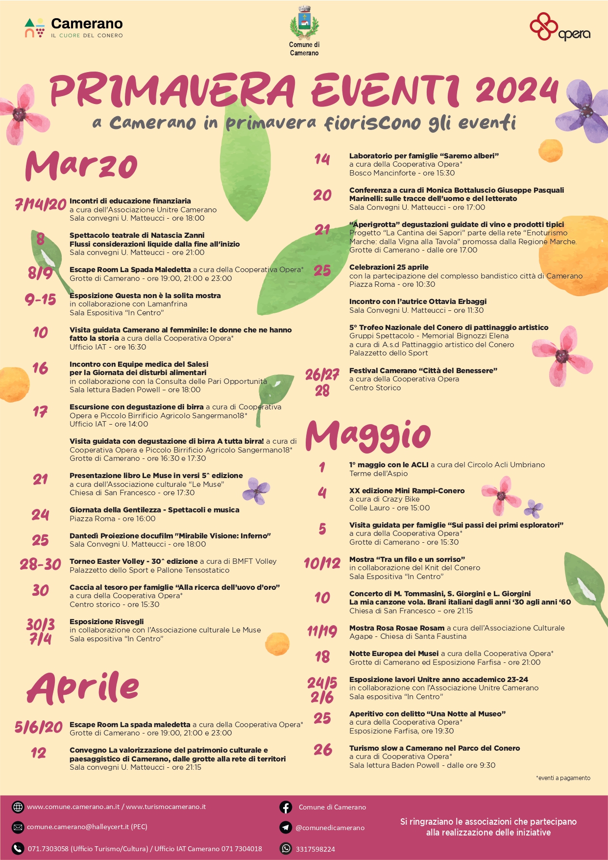 Per celebrare la prossima primavera, il Comune di Camerano ha preparato un ricchissimo cartellone di eventi che vi accompagneranno fino a Maggio, dalla scoperta delle birre artigianali alle mostre, passando per presentazioni di libri e suggestivi "Aperitivi con Delitto", per un totale di ben 30 eventi legati alla cultura, all'enogastronomia e al divertimento.
