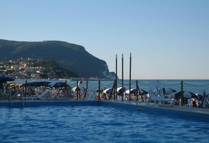 Sicuramente la nostra posizione fronte mare e il fatto di godere di una spiaggia attrezzata riservata ai clienti e arricchita da due bellissime piscine - una con acqua bassa ideale per i bambini - che si trovano nella nostra splendida terrazza panoramica con vista sul promontorio del Monte Conero. La terrazza, situata nei pressi della spiaggia privata, è un luogo fantastico per i nostri clienti anche per un aperitivo serale a bordo piscina dopo una giornata trascorsa al mare.