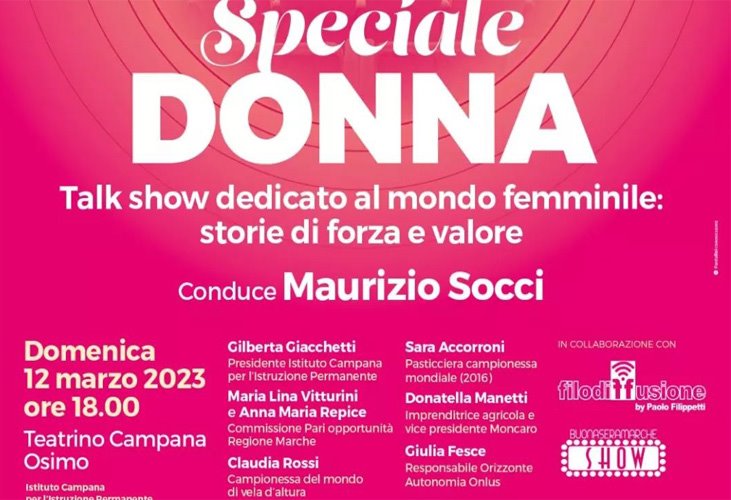 Pochi giorni fa, abbiamo celebrato la Festa della Donna, tra mimose e buoni propositi (troppo spesso inattesi). Infatti, troppo spesso ci si limita a ricordarsi dell'universo femminile per un giorno per poi tornare ad una normalità, che è sempre meno normale. Dalla volontà di dare voce alle Donne, nasce il talkshow Speciale Donna, pensato dagli Amici di Filodiffusione e realizzato in collaborazione con l'Istituto Campana di Osimo e patrocinato dalla Regione Marche.