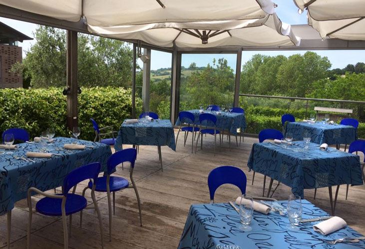 Nel periodo estivo il ristorante si sposta nel giardino e nella terrazza esterna, con i suoi tavolini all'aperto e la splendida vista sulla campagna marchigiana.