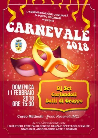 L’Amministrazione Comunale di Porto Recanati in collaborazione con: i Quartieri, Ente Palio Storico, Associazione Centro danza e Spettacolo 9 Muse, Associazione Starlight, Associazione Arte e Dominio, organizza il Carnevale 2018. L’evento si terrà Domenica 11 febbraio dalle ore 15:30 in Corso Matteotti.
