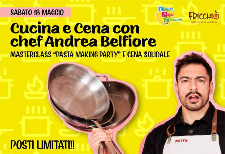 Anche questa volta, il Centro stupisce tutti con un'iniziativa unica nel suo genere, legata alla solidarietà e alla buona cucina. Infatti, direttamente dal reality show "Pechino Express", arriverà lo Chef Andrea Belfiore, per una giornata di pura delizia culinaria. Si inizia alle ore 18 del 18 maggio con un laboratorio di sapori e saperi durante il quale Chef Belfiore condividerà tutto quello che sa sulla pasta fresca fatta in casa (costo 19€ - massimo 20 persone). Il tutto poi si concluderà alle ore 20 con una cena realizzata in collaborazione con lo Chef e la simpaticissima brigata di Fricchiò, ecco il menù: