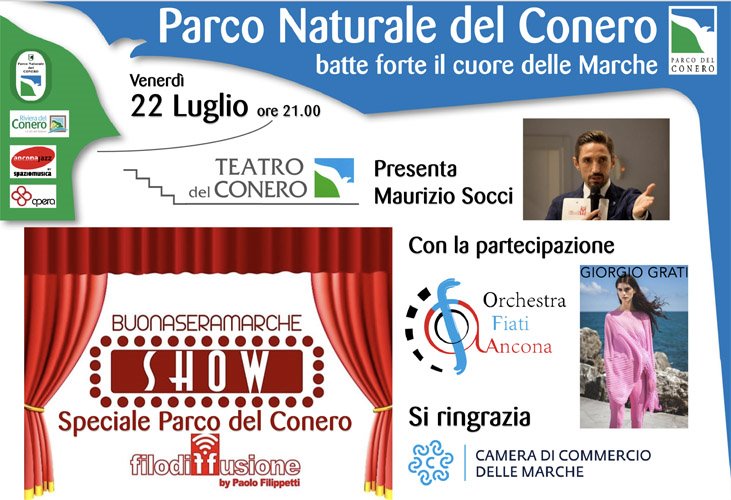 Tra gli ultimi eventi appartenenti al Festival del Conero, non possiamo non menzionare il Buonasera Marche Show, talk show dedicato alla promozione del territorio ideato da Paolo Filippetti di Filodiffusione. Questo interessante format, che negli ultimi anni ha riempito le piazze ed i teatri dell'intera Regione, è finalmente pronto a tornare sulle terre del Conero.