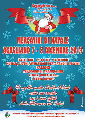 Stand, musica, giochi ed attrazioni per tutte le età: Karaoke, Truccabimbi, Tranpolieri, Clown e Giocolieri… Vi aspetta anche Babbo Natale nella sua casetta con i doni offerti dalle Patronesse del Salesi - Info 0719068031 - segreteria@comune.agugliano.an.it