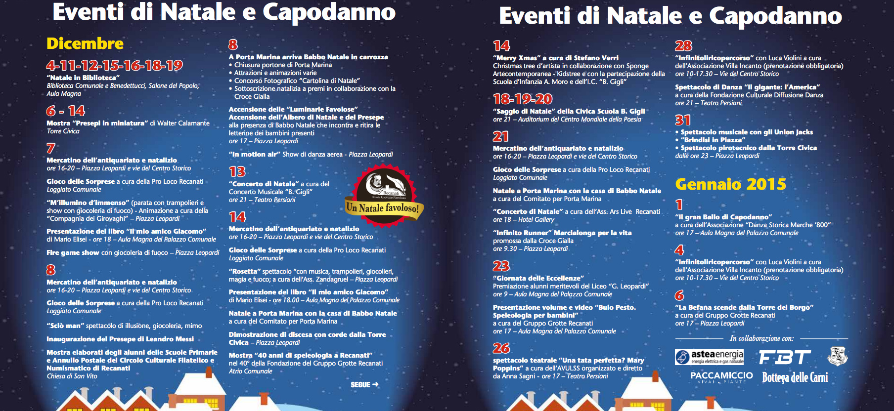 Il mercatino dell’antiquariato e natalizio, sarà presente in Piazza Leopardi e nelle vie del centro storico. Molti gli eventi collegati. Per il programma dettagliata scoprite il Natale Favoloso di Recanati.