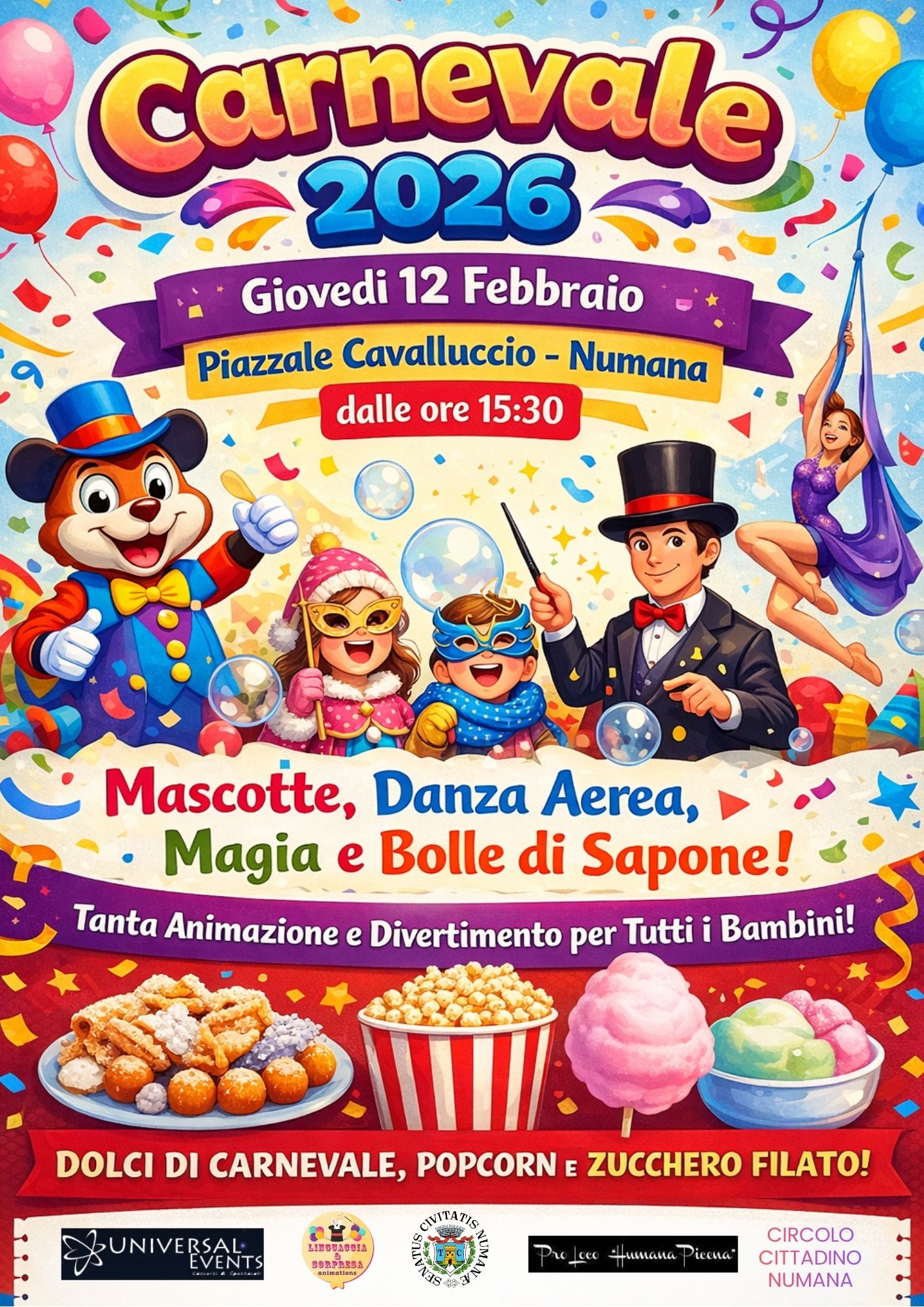 Il bellissimo borgo marinaro di Numana si prepara per il Carnevale 2026, un evento all'insegna del divertimento e della fantasia, con due appuntamenti pensati per coinvolgere grandi e piccini. Le iniziative, organizzate da Universal Events, in collaborazione con Pro Loco Humana Picena e il Circolo Cittadini di Numana, amimeranno il centro cittadino con spettacoli, laboratori e momenti di svago.