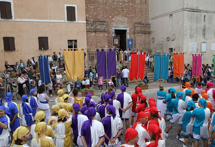 Nella giornata di domenica, come chiusura delle cerimonie, potrete assistere alla consegna del corredo alla futura coppia di sposi assieme all'esibizione dei tamburini e degli sbandieratori.