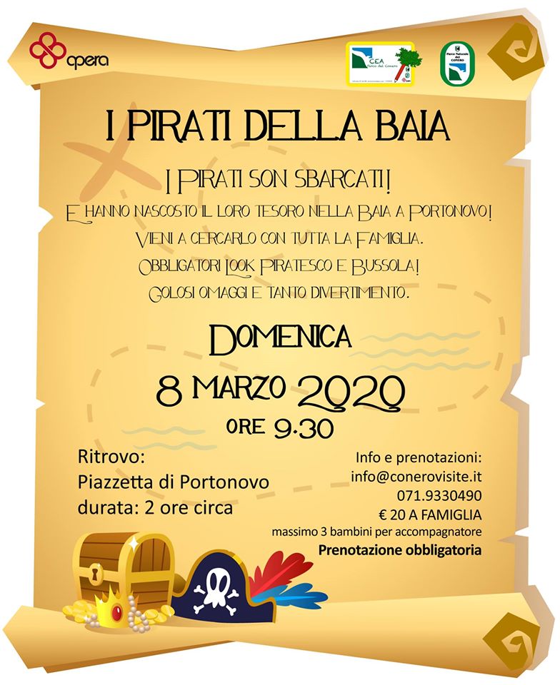 "I Pirati son sbarcati a Portonovo e hanno nascosto i loro forzieri colmi di monete e gioielli tra i luoghi misteriosi della Baia! Ti aspettiamo con tutta la famiglia per tuffarti in una Caccia al Tesoro ricca di enigmi e trabocchetti. Ma per comprendere il codice piratesco, non dimenticare di vestirti da Pirata e di portare con te la tua Bussola!!"