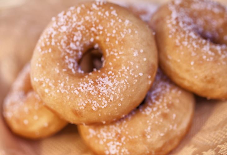 Una volta lievitato l'impasto, prendetene dei pezzi e createne delle ciambelline, immergetele poi nell'olio bollente e fatele dorare su entrambi i lati. Asciugatele con un po' di carta e copritele di zucchero a piacimento.